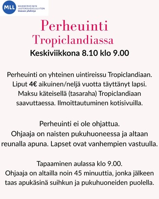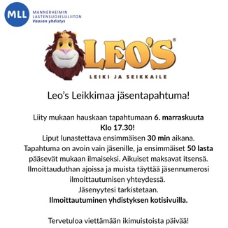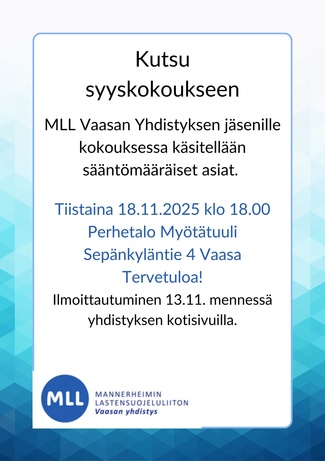 Paikat ovat täynnä. Peruthan paikkasi mikäli et pääse paikalle! Sähköpostilla osoitteeseen: vaasanyhdistys@mll.fi