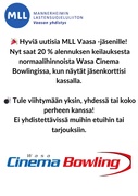 • 20 % alennuksen keilauksesta normaalihinnoista Wasa Cinema Bowlingissa, kun näytät jäsenkorttisi kassalla. Ei yhdistettävissä muihin etuihin tai tarjouksiin.