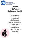 MLL Vaasan yhdistyksen jäsenenä sinulla mahtavat jäsenedut käytössäsi. Voimassa olevat jäsenedut näet oma MLL-sivustolta, josta löydät myös jäsenkorttisi.
