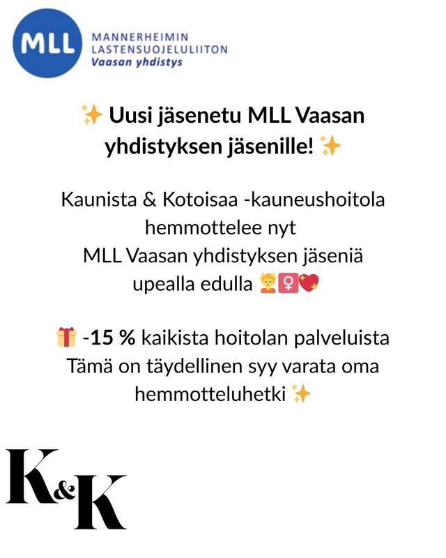 • Kaunista & Kotoisaa -kauneushoitola tarjoaa MLL Vaasan yhdistyksen jäsenille jäseneduksi -15 % kaikista palveluistaan.