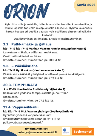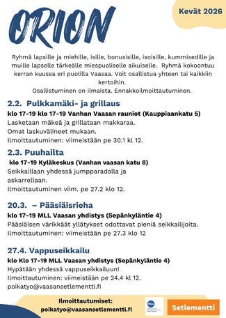 Orion on ryhmä lapsille ja miehille – isille, bonusisille, isoille veljille, isoisille, kummeille ja muille lapselle tärkeille miespuolisille aikuisille. Ryhmä tarjoaa yhteistä tekemistä ja aikaa vahvistaa lapsen ja aikuisen välistä suhdetta.